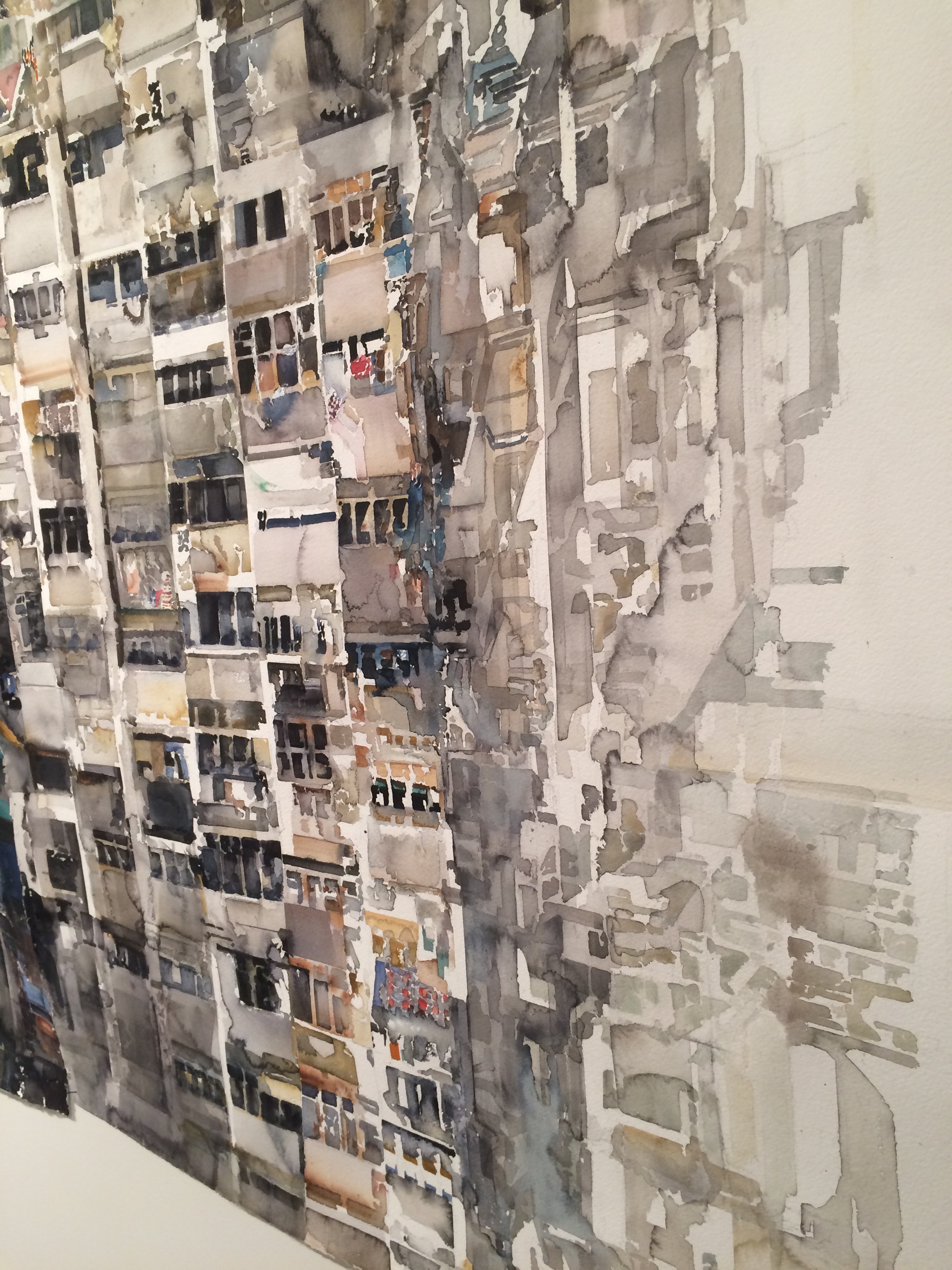 Two things struck me as I took a few steps into the exhibit: scale and intensity. Most of the works were huge – well over four by four feet, and some filled entire walls! Large scale allows paintings to be more like sculpture to me: more immersive and rewarding from up close and also from far away. I’ve rarely seen watercolor paintings that covered such a range of darker shades: I don’t think there was much water in this watercolor.