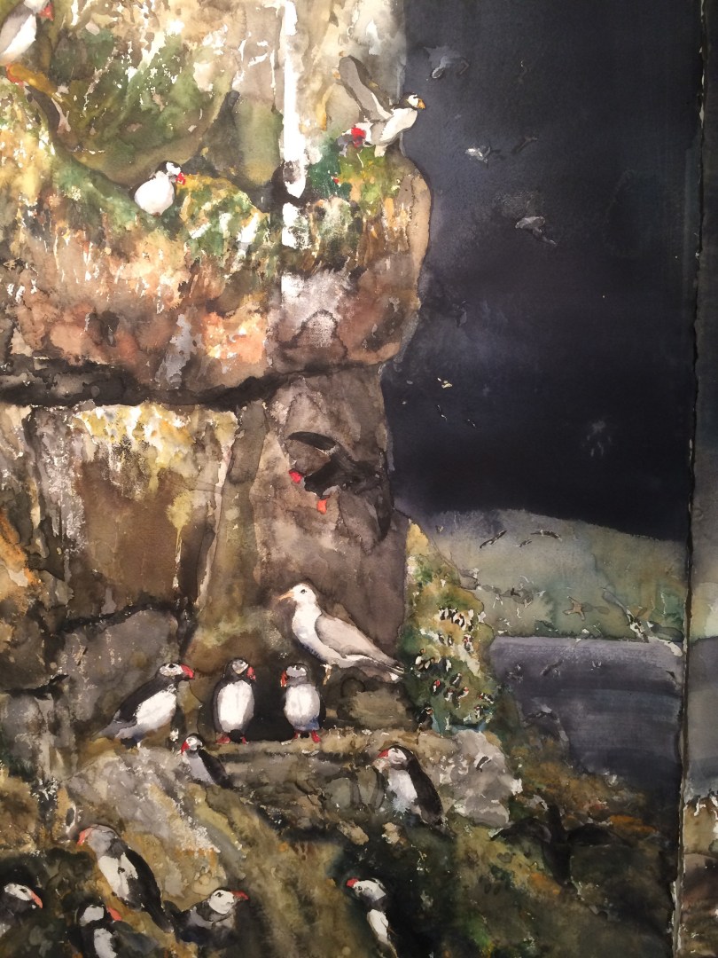 It was a surprise to achieve such success with light play in this medium, and also such fine detail. The photo at the start of this post is a small portion, maybe about 1/4 of the full painting, of a shoreline scene showing a variety of birds, mostly puffins.