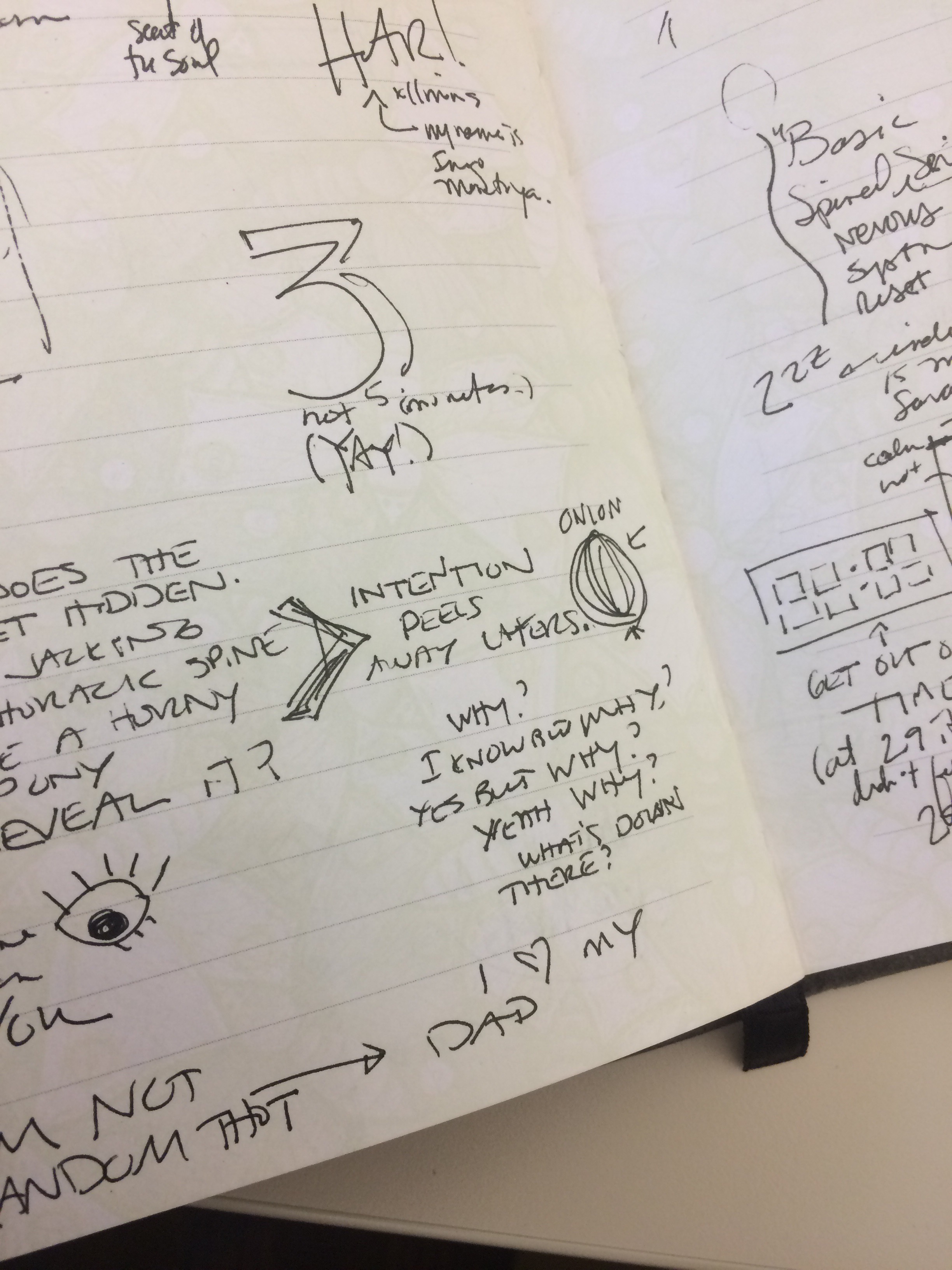 This technique is a great alternative to frantically transcribing every word a presenter utters! You wait for and identify the concepts in the presentation that are meaningful to you, and then you draw a picture. It’s ok if the picture is largely typographical (i.e. is words drawn fancily) but allowing your brain to put together images that bring life to the ideas is the most important aspect of this practice. In its mindfulness, it’s a very yogic way to experience a presentation. I did it for all of the longer workshops; pictured here is a partial page from a Kia Miller workshop. I got better at it by Sunday.
