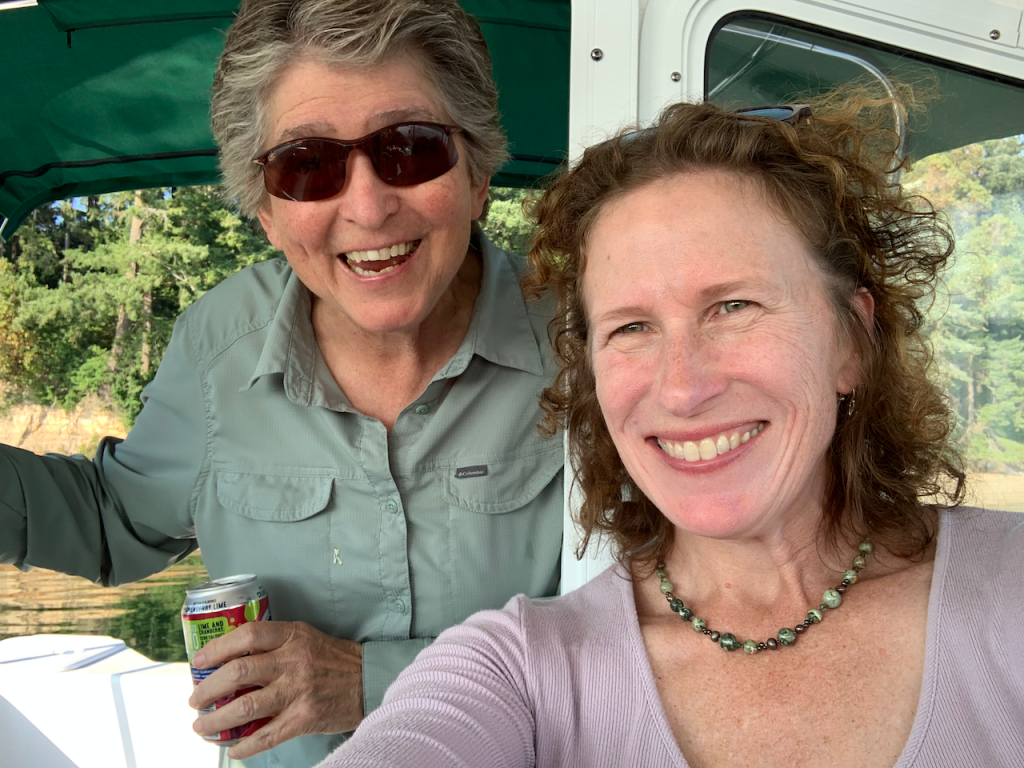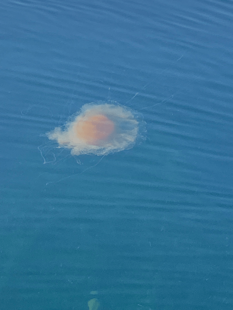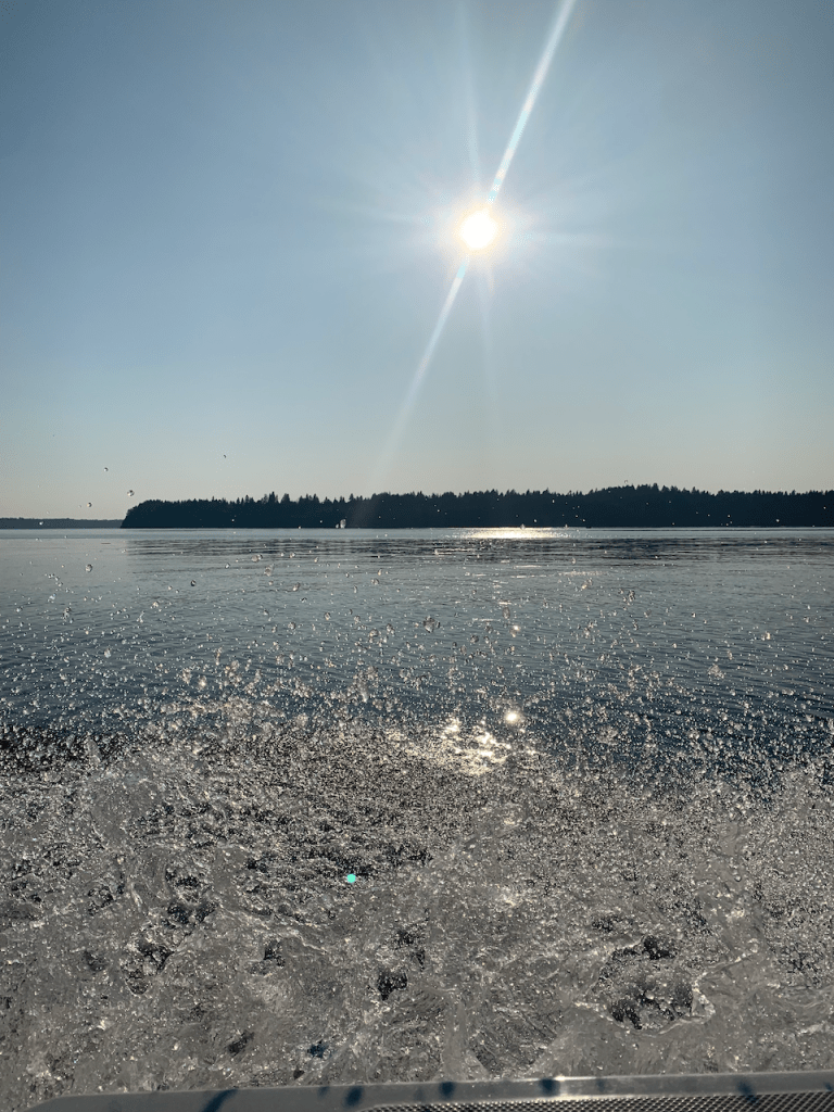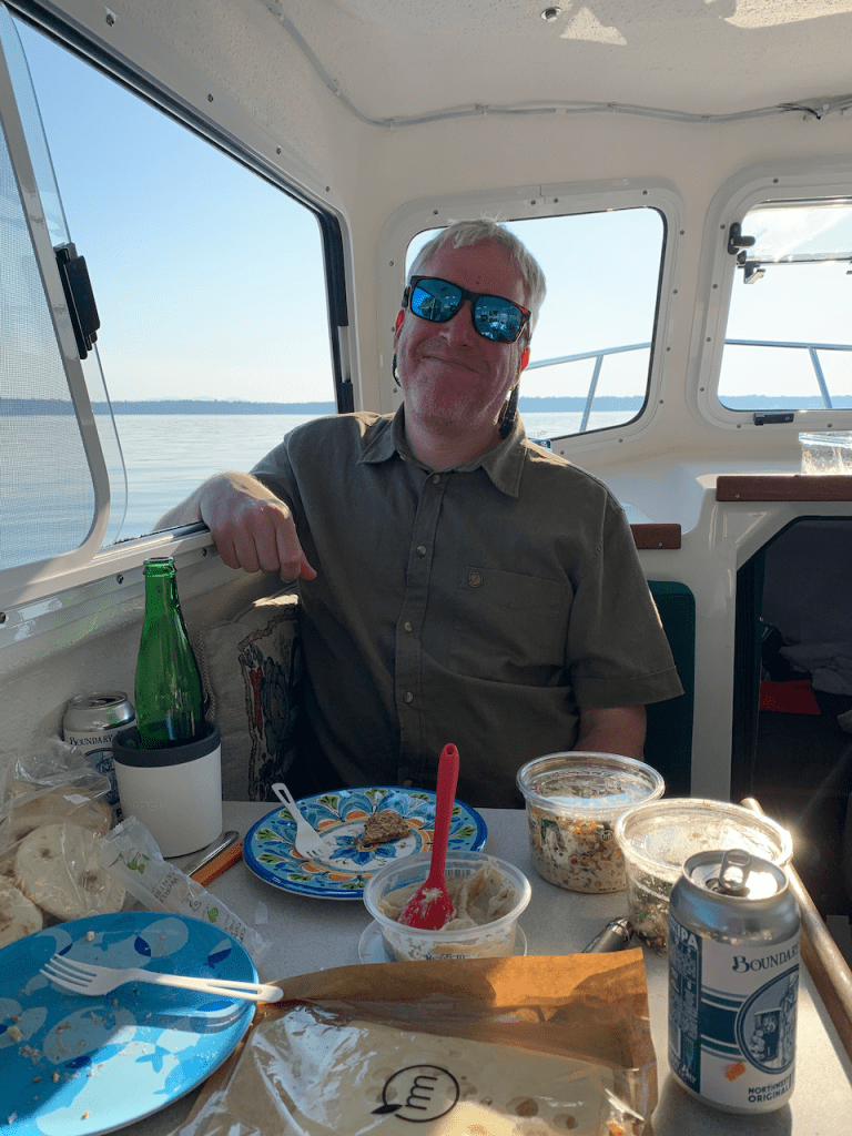 It’s hard to pick a favorite part, but I was so happy to finally enjoy a ride in Robbi’s new C Dory fishing boat! The weather and tides were amenable, midweek. She took us on a smooth, cooling, and scenic trip around Anderson Island, checking out the Nisqually Delta and enjoying a picnic dinner on the boat. We’d heard rumors of an orca sighting here, recently but we only saw porpoises, a seal, lots of jellies, more than a few crested cormorants and a guillemot or two. Countless gulls because: sea.