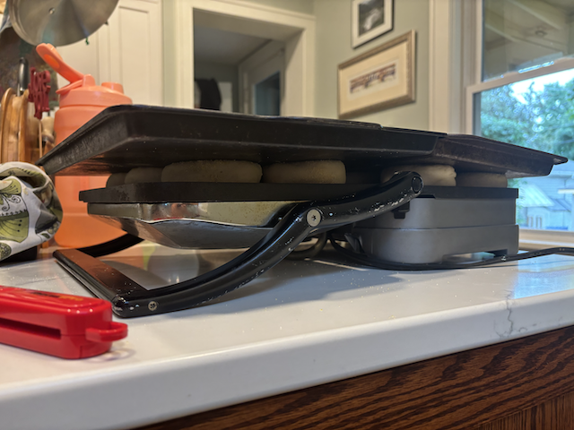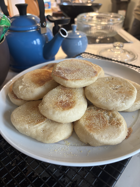 English muffins! I had no idea that they are made on a griddle and need a light press (of cookie sheets). Here’s the English Muffin recipe I used, from King Arthur Flour.