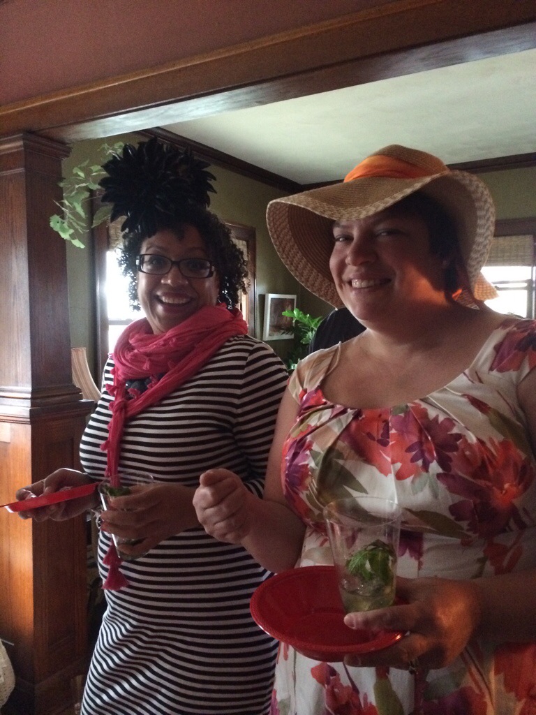 - Getting dolled (and … gented?) up! We invited people to dress up for the party, and encouraged them by offering prizes for the best bow tie and ladies’ hat. Our friends got very imaginative and filled with nerve! It was fun to award prizes, and even more fun to see our house full friends in seersucker, ties of various flavors, feathers, flowers, and even a felt piglet. Our prizes were two pairs of commemorative Derby glasses, each filled with a miniature rose bunch.