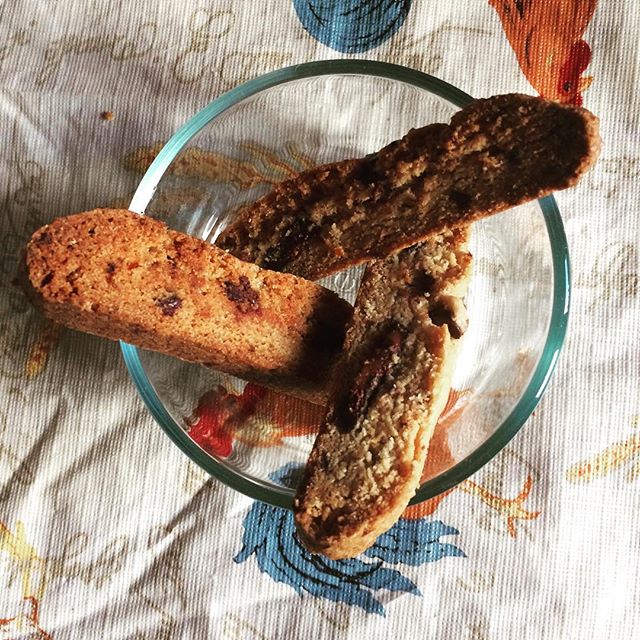 So. Here’s a cookie recipe. It’s a slight variation on one of my favorite cantucci/biscotti recipes, from the Veganomicon cookbook, by Isa Chandra Moskowitz and Terry Hope Romero. I love this recipe and all its variations because it’s got a snappy crunch that all other biscotti/cantucci recipes – most of which use eggs and/or butter – lack.