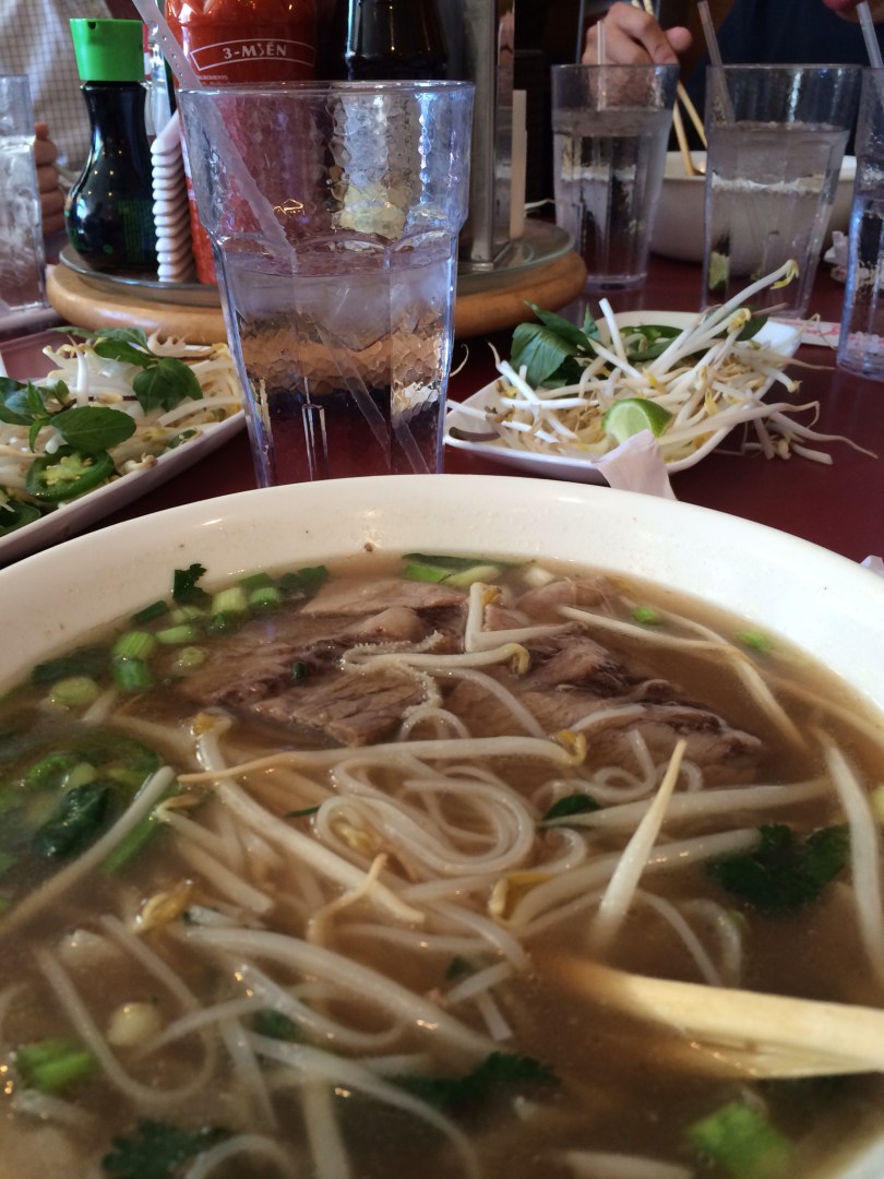 I ordered #3 on the menu: rare lean beef, well done flank and tripe. I filled the mid-sized bowl up even more with bean sprouts, hot peppers and basil. Steve and I agreed this was the best pho we’d ever had – the broth’s flavor, which had a little more of a star anise note than anything else specific, was astoundingly good, especially if fortified at least a little with the industrial-strength chili sauce.