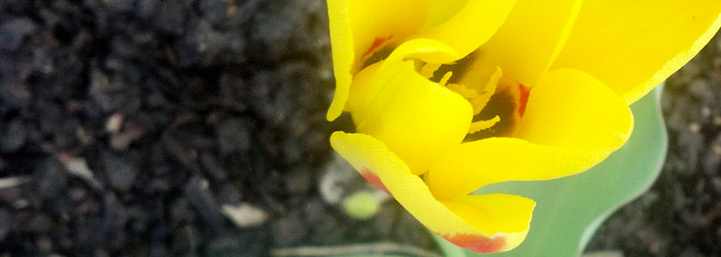 We’ve now had at least four weekends in which we could have done spring yard cleanup, but haven’t. It’s a very early spring! I’m not accustomed to even seeing the soil in April, nor decaying plant matter from last year, nor even the beauteous tulips you see above. So far I’ve refused to pick up the rake, though I did trim back some iris and hosta, as both was already starting to send up electric green leaves.